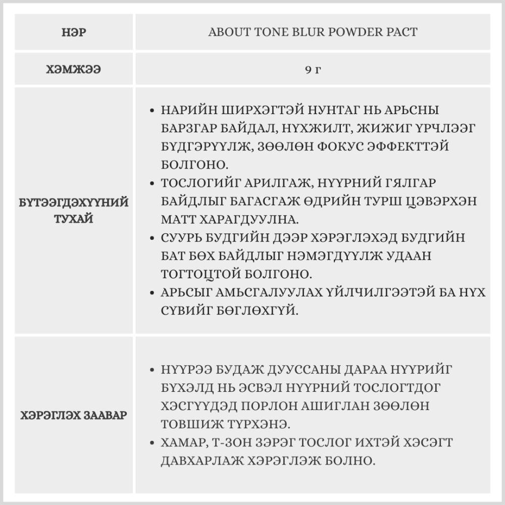 Арьсны өнгийг тэгшилж, нүхжилтийг бүдгэрүүлэн зөөлөн blur эффект үүсгэдэг нунтаг pact. Тослогийг дарж, өдрийн турш матт харагдуулах ба будгийн тогтоцыг уртасгаж хөнгөн, зөөлөн мэдрэмж өгнө.