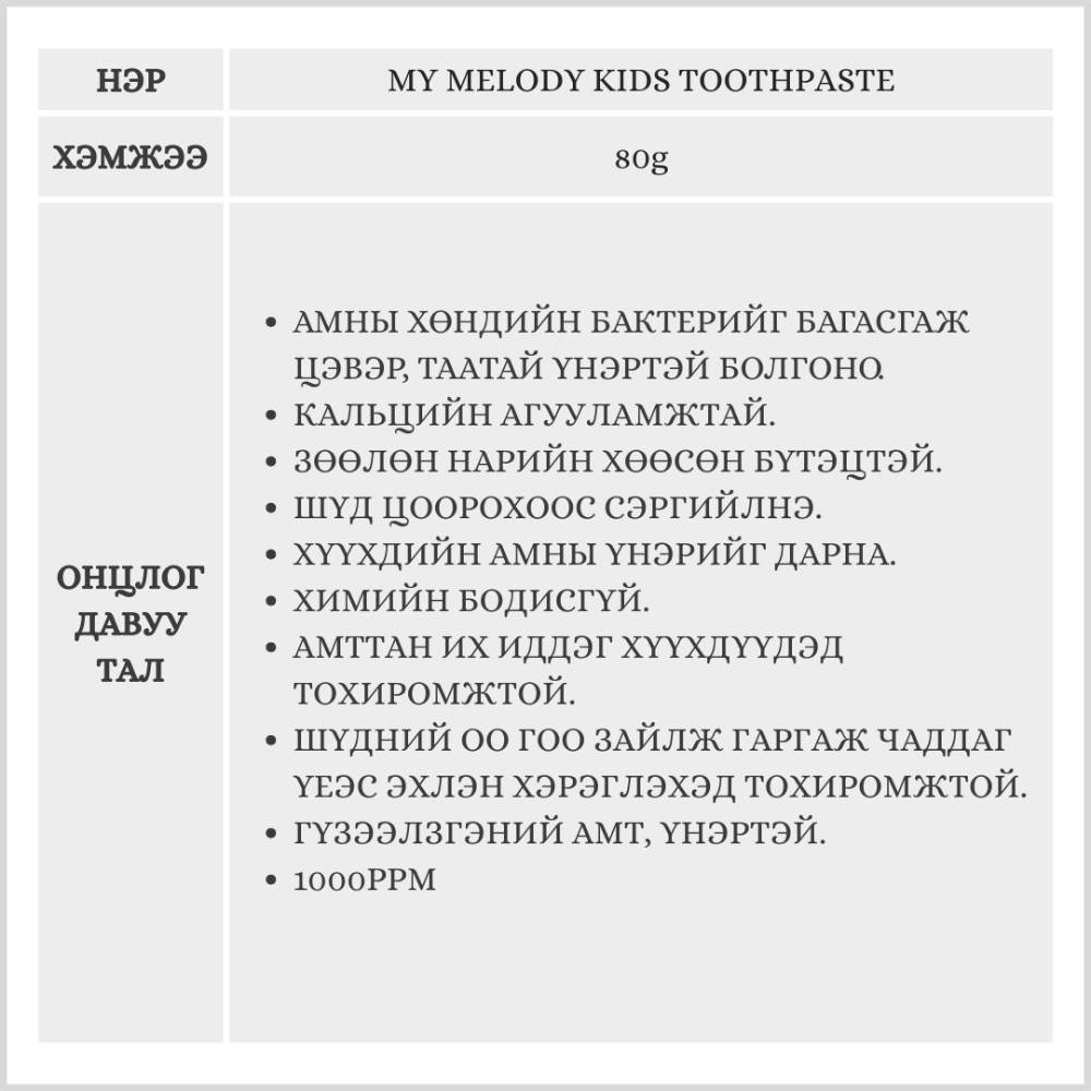 MY MELODY KIDS TOOTHPASTE/ ХҮҮХДИЙН ШҮДНИЙ ОО/ 3 ШИРХЭГ ОО