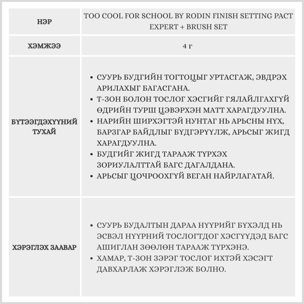 Тослогийг дарж, будгийн тогтоцийг уртасгах үйлчилгээтэй мэргэжлийн finish pact. Нүхжилт болон барзгар байдлыг бүдгэрүүлж, арьсыг жигд матт харагдуулна. Зориулалтын багс дагалдах ба нунтагийг илүү цэвэрхэн, жигд түрхэх боломжтой.