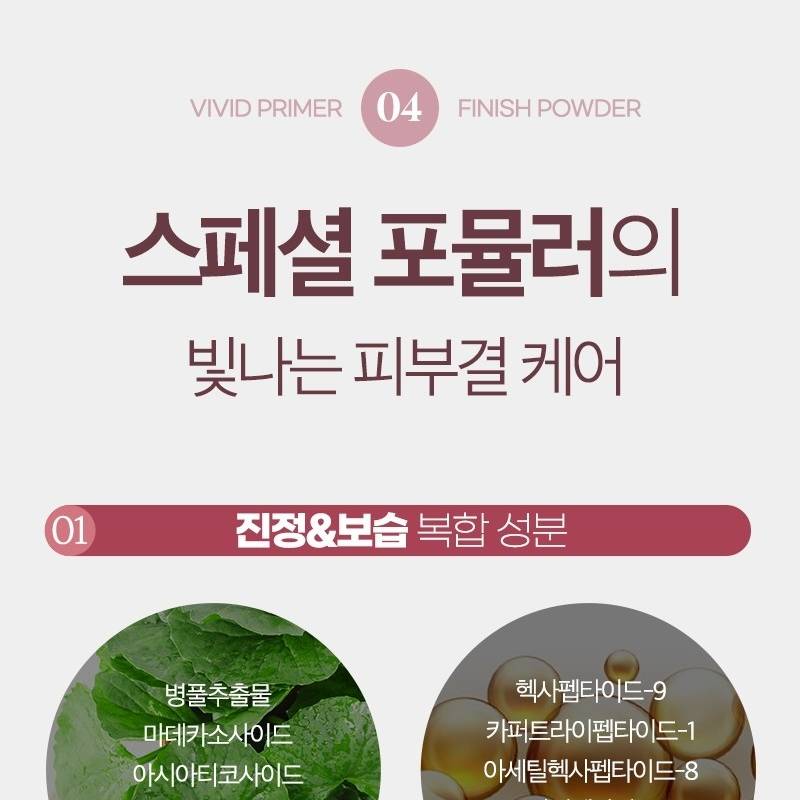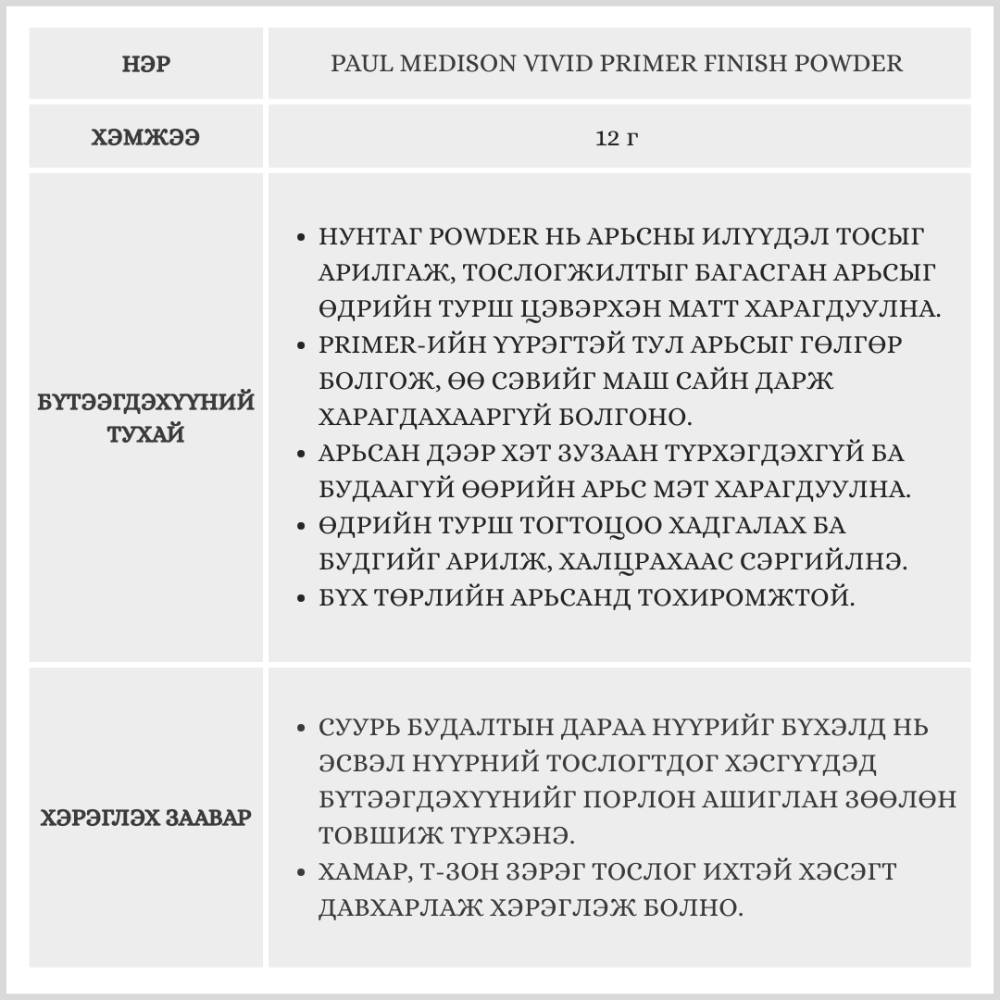 Арьсны илүүдэл тослогийг дарж, өө сэвийг бүдгэрүүлэн жигд гөлгөр харагдуулах үйлчилгээтэй Finish Powder. Будгийн тогтоцыг уртасгах ба бүх төрлийн арьсанд тохиромжтой.