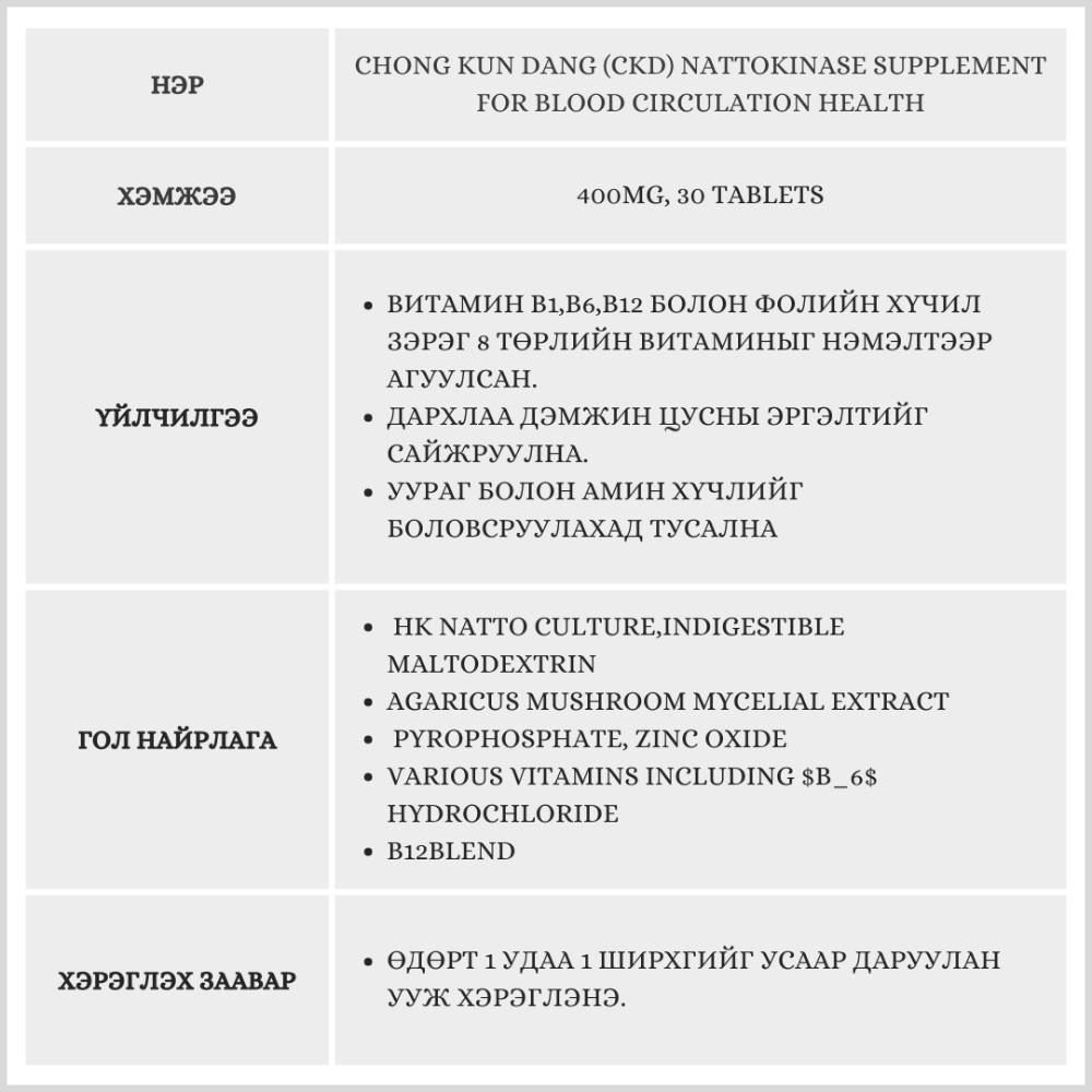 Chong Kun Dang (CKD) Nattokinase Supplement for Blood Circulation Health /Нэмэлт тэжээл/