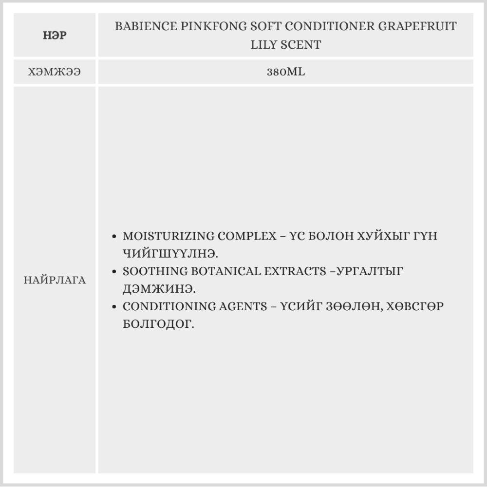 BABIENCE PINKFONG SOFT CONDITIONER GRAPEFRUIT LILY SCENT, 380ML / ХҮҮХДИЙН ҮСНЫ АНГИЖРУУЛАГЧ /