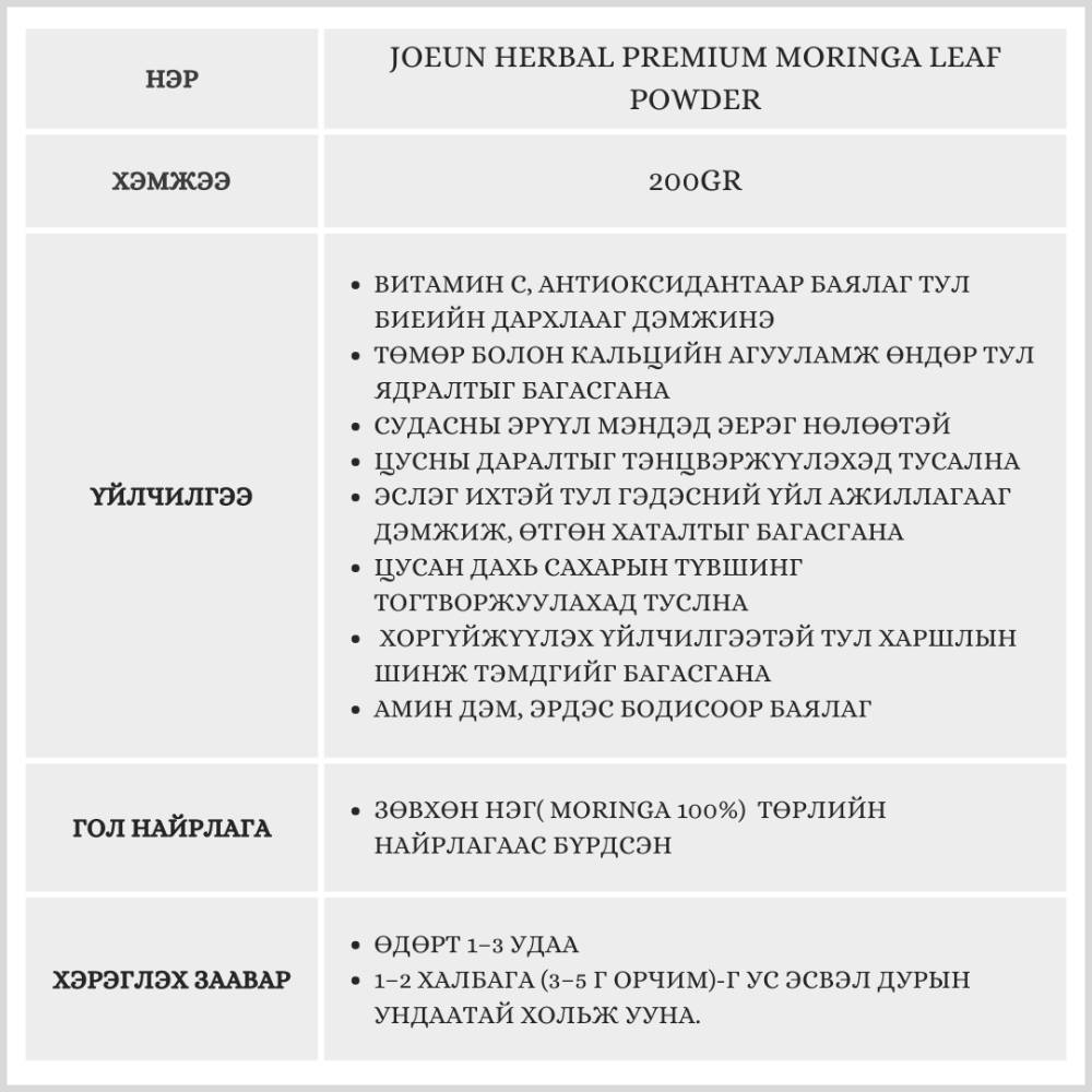 Моринга навчны нунтаг нь 100% цэвэр моринга навчаар хийгдсэн эрүүл мэндийн бүтээгдэхүүн. Витамин, эрдэс бодис, эслэгээр баялаг тул дархлаа дэмжин, биеийн тэнцвэрийг хадгалах, өдөр тутмын эрч хүчийг нэмэхэд тусална.