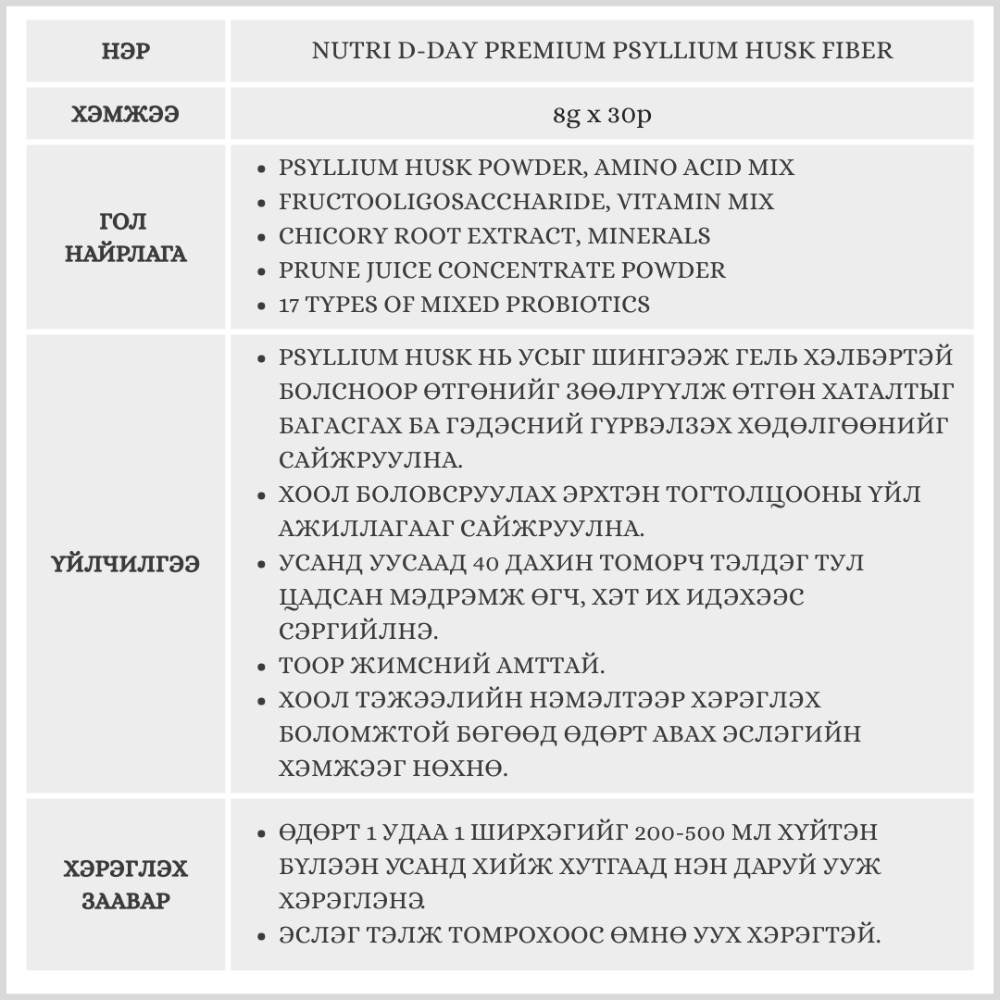 Nutri D-Day Premium Psyllium Husk эслэг нь гэдэсний гүрвэлзэх хөдөлгөөнийг сайжруулан өтгөн хаталтыг багасгаж хоол боловсруулалтыг дэмжинэ. Тоор жимсний амттай.