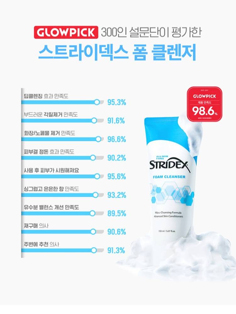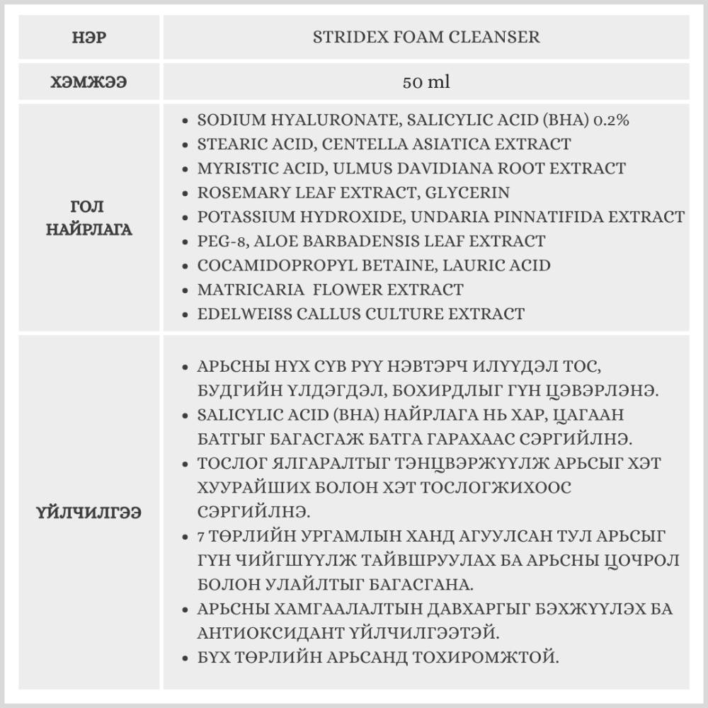 Stridex Foam Cleanser нь салицилийн хүчил (BHA) агуулсан, тослог болон батгатай арьсанд зориулсан нүүрний хөөсөн цэвэрлэгч юм. Нүх сүвийг гүн цэвэрлэж, хар батга, илүүдэл тос, бохирдлыг үр дүнтэй арилгана. Мөн ургамлын хандтай тул арьсыг цочроохгүй ба чийгшүүлж, тайвшруулна.